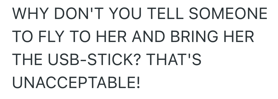 This raised a lot of questions. How could someone expect the files to be transferred to a USB stick and delivered in time if they wouldn’t be in the office?