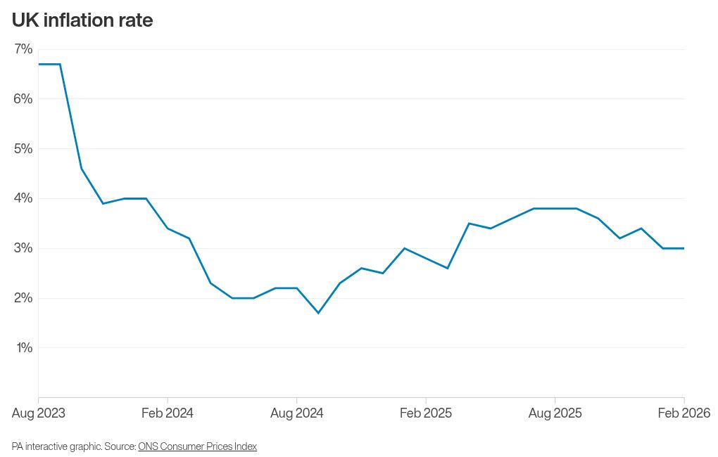 UK inflation remained steady at 3% in the previous month, as reported by official statistics. This figure did not account for the effects of the ongoing conflict in the Middle East, which began towards the end of February. The Consumer Prices Index (CPI) inflation rate stayed the same as it was in January, aligning with predictions made by economists.